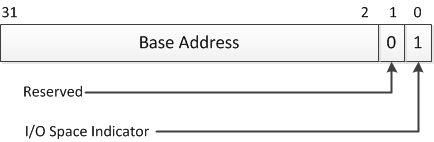 Figure 6 shows the format of the PCI BAR that maps to CPU I/O space. As you can see, the lowest two bits in the 32-bit BAR are hardcoded to "01" binary value. Actually, only the lowest bit matters; it differentiates the type of the BAR, because the bit has a different hardcoded value when the BAR types differ. In BAR that maps to CPU I/O space, the lowest bit always hardcoded to one, while in BAR that maps to CPU memory space, the lowest bit always hardcoded to zero. You can see this difference in Figure 6 and Figure 7.