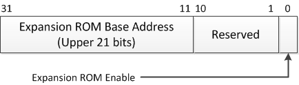 Figure 8 shows the XROMBAR format. As you can see, the lowest 11 bits are practically hardcoded to zero—because the expansion ROM enable bit doesn't act as an address bit, only as a control bit. This means a PCI expansion ROM must be mapped to a 2 KB boundary. The "expansion ROM enable" bit controls whether access to the PCI expansion ROM is enabled or not. When the bit is set to one, the access is enabled and when the bit is set to zero the access is disabled. If you look at Figure 3 "PCI Configuration Registers Type 0," you see the command register at offset 04h. There's one bit in the command register called the memory space bit that must also be enabled to enable access to the PCI expansion ROM. The memory space bit has precedence over the "expansion ROM enable" bit. Therefore, both the memory space bit in the command register and the "expansion ROM enable" bit in the XROMBAR must be set to one to enable access to the PCI expansion ROM.