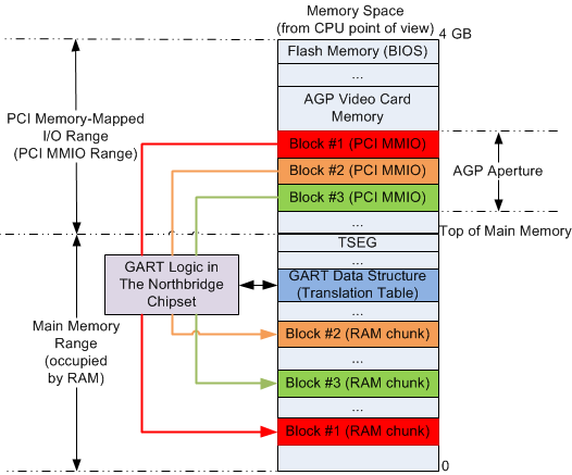 One of the AGP-specific supports in the northbridge is the so-called AGP graphics address remapping/relocation table (GART) hardware logic. AGP GART—or GART for short—allows the video card chip in the video card to use a portion of the main memory (RAM) as video memory if the application(s) that use the video memory runs out of the onboard video memory. The GART hardware is basically a sort of memory management unit (MMU) that presents chunks of the RAM—allocated as additional video memory—as one contiguous memory to the video card chip. This is required because, by the time the video card chip requests for additional video memory to the system, the RAM is very probably already fragmented because other applications have used portions of the RAM for their own purposes.
