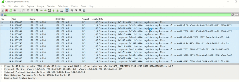 The “-domain” option is used to select the primary domain used to handle the DNS requests, in this case, “test.mydnsserver.live”. Additionally, as a way of bypassing firewalls, the “-prefix” option can be used to add a prefix as “cdn”. Some examples are presented below.