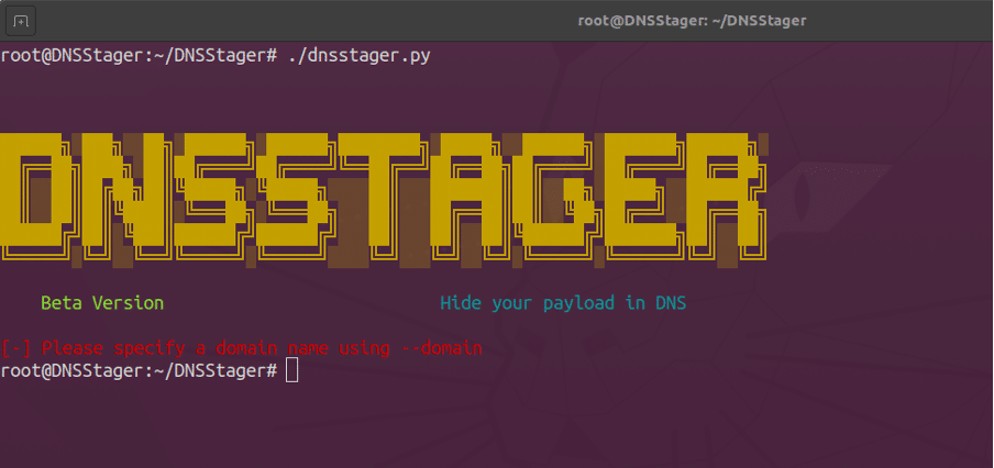./dnsstager.pyFigure 3: Banner of DNSStager confirming that it was installed successfully.