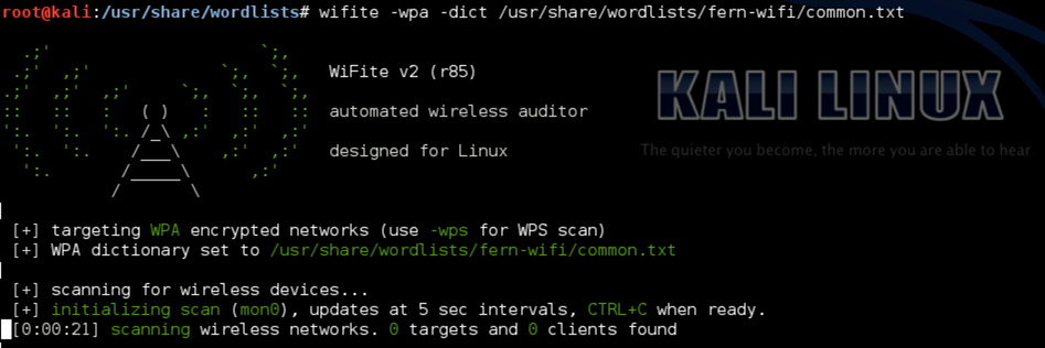 To start wifite for cracking a WPA access point, give it the option -wpa to only target WPA networks. Also, give it a dictionary file as an input for cracking the WPA passphrase with the -dict option. In kali linux, the wordlists are stored at the location /usr/share/wordlists. Wifite will now start scanning for WPA access points.