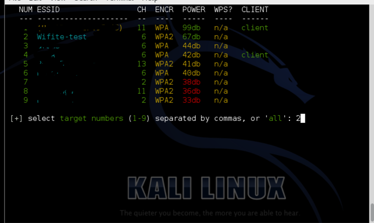 Press Ctrl+C to give a target number. In my case, the target number is 2 which is an access point i have configured for testing purposes. The access point uses WPA2-PSK encryption with the key as "password".