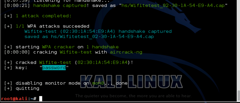 And as you can see, Wifite has successfully found the passphrase for the access point.