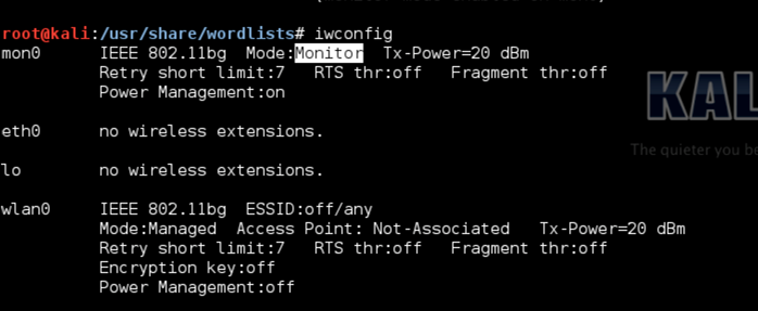 Another cool option in Wifite is to anonymize your MAC address using the -mac option. Even though it is quite trivial using simple commands or macchanger utility to change the MAC address for a specific interface, it is good to have this feature in the tool itself. However, in order to make this work, you first have to take that specific interface for which you want to change the MAC address down to managed mode if it is in monitor mode previously. You can use the command iwconfig to check all the interfaces that are in monitor mode and then take them down using the command airmon-ng stop interface-name command. As we can see from the image below, the mon0 interface is in monitor mode.