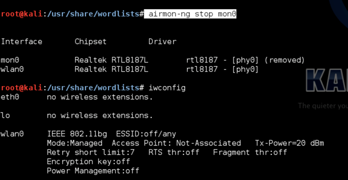 Hence, lets take it down using the command airmon-ng stop mon0