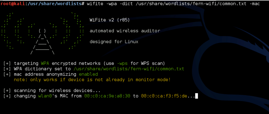 Now we can add the -mac option to anonymize the MAC address. As you can see, Wifite is intelligent enough to change the MAC address to something that is similar the existing MAC address of the interface and not to something ridiculous (for e.g AA:BB:CC:DD:EE:FF) which is a giveaway.