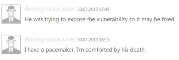 The fact is that Barnaby Jack died only a week before his presentation on pacemaker hacking at the Black Hat in Las Vegas (2013). For his sympathisers, the official cause of death – drug overdose – sounds utterly implausible. Someone might say that both this case and the strange death of the journalist Michael Hastings merely awakens whistleblowers and conspiracy thrill seekers out of their slumber. Someone might also say that people in power prefer some secrets to remain buried and some words to be left unsaid.