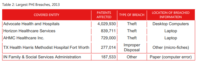 The five largest healthcare data breaches in 2013 covered 85.4% of the exposed records reported for the year. The top three were caused by theft of desktop and laptop computers.