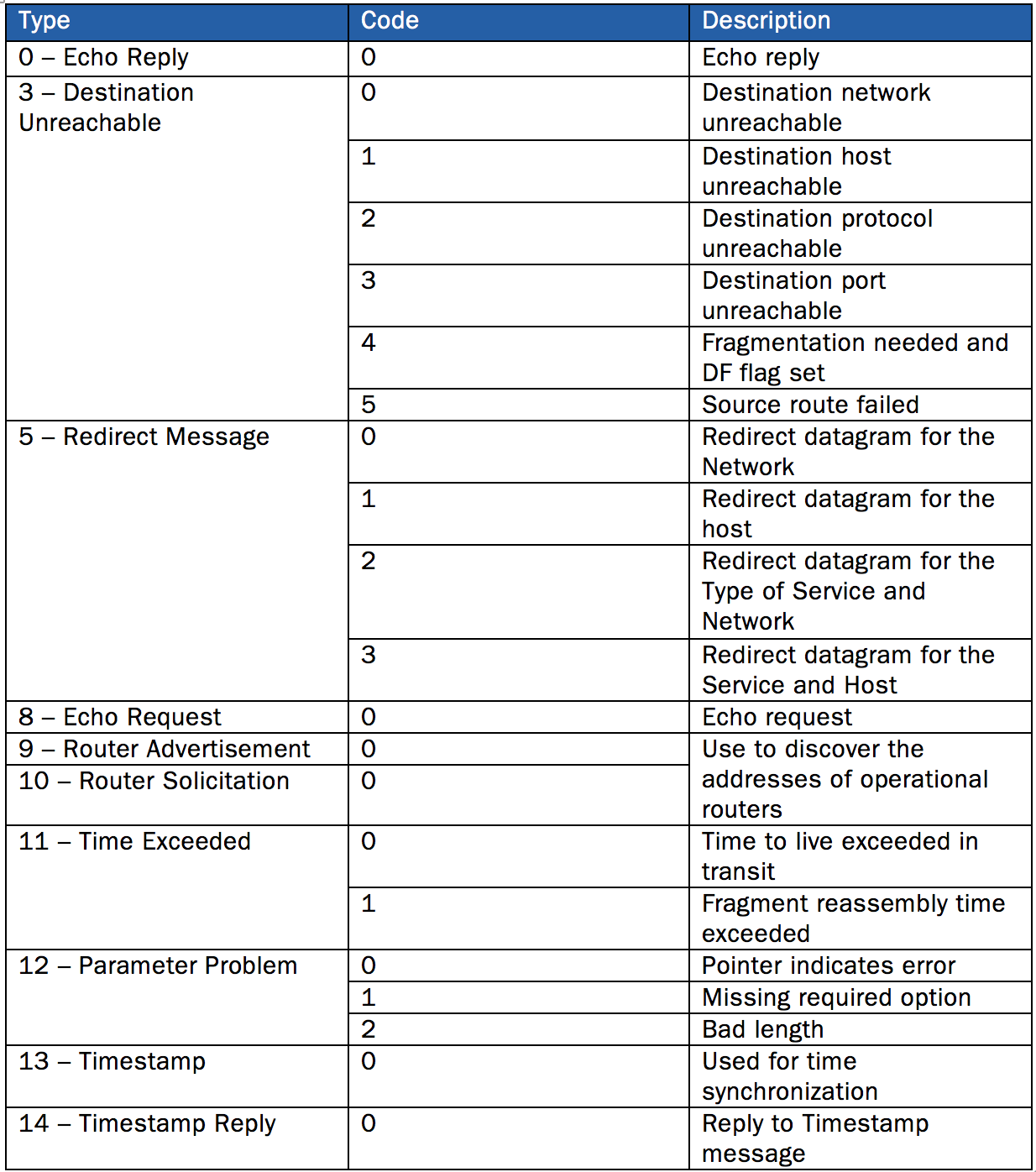 For some types, there are multiple code values intended to provide additional information. For example, a type 3 ICMP message with a 0 code points to issues with the destination network, while a 1 code means that the issue is that the particular host is unreachable.