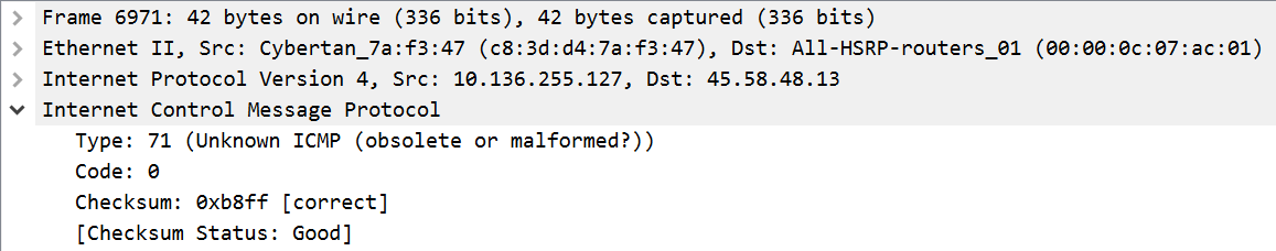 The summary of the ICMP packets provided by Wireshark does not show the actual values being carried by the malformed ICMP packets. However, this data is visible in each individual packet summary. The image above is the summary of the first malformed ICMP packet, which has a type value of 71. The exfiltrated file can be reassembled manually using Wireshark or more efficiently using a tool like the scapy package in Python.
