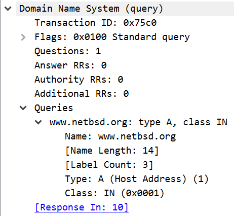 The images above show the structure of a simple DNS request and response. As shown at the top of the request packet, a single request can carry multiple queries. The request data structure informs the DNS server of the type of packet (query), the number of questions that it contains (one), and then the data in the queries. In this case, the request is for the A record for www.netbsd.org.