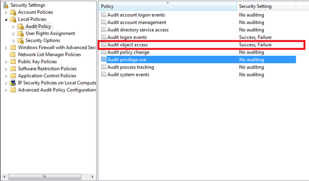 For example, the below illustration is of logging a user activity on an object. For demonstrative purposes, I have created a file named "Test_Access" on my system. Auditing on object access is enabled in my system, like below in the Local Security Policy.