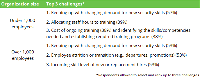 - Large organizations impacted more by employee attrition: Following “keeping up with the changing demand for new security skills,” the top-ranked employee development challenges at large organizations directly correlate to employee attrition and transition. This may be due to two factors: