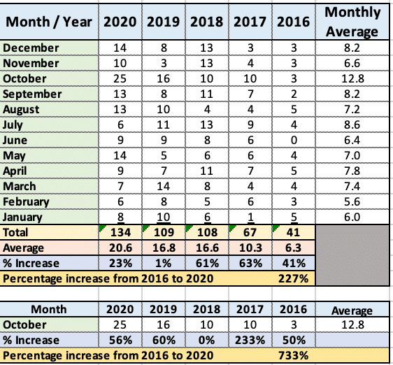 The number of events rose 3,250% from 2006 to 2020, with annual averages from 4 to 134, respectively.⁵ Significant increases were observed from 2006 to 2007 and 2016 through 2018. Focusing on the previous five (5) years 2016 through 2020, there were 41 (average 6.3 per month/pm at a 41% increase) in 2016 and 132 (20.6 pm at a 23% increase) in 2020. The months of October in each year revealed unusual spikes.