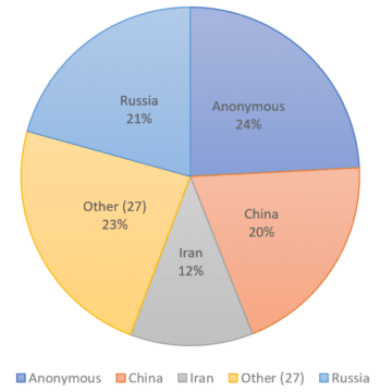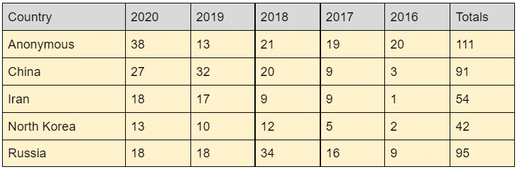 Focusing on the average of October incidents from 2016 – 2020, the number rose from 3 to 25 or an increase of 1,150%.⁶ ⁷ When analyzing the increases further, six (6) countries or entities were habitual attackers: Anonymous, China, Iran, North Korea, Russia and the United States. The United States’ reported incidents (14) were mitigation or countermeasures in response to breaches or attacks and were not further evaluated.