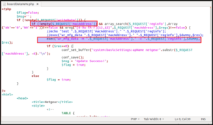 As highlighted, parameter macAddress is passed to the exec command (the second highlighted part) and the input is not filtered (first highlighted). exec is the function in PHP used for executing OS commands. The input is taken as-is; thus, we can also pass OS commands with the macAddress parameter.