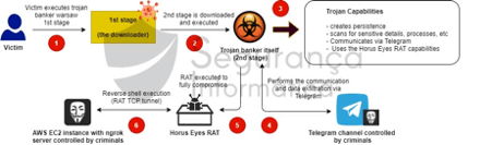 At that moment, the first stage of the infection chain is completed by the warsaw trojan, which downloaded and executed the RAT on the target machine. From this point on, a modified version of the Horus Eyes RAT is ready to capture the user’s activity, collect credentials, control the user navigation and allow the criminals remote access to the machine to fully compromise the system.