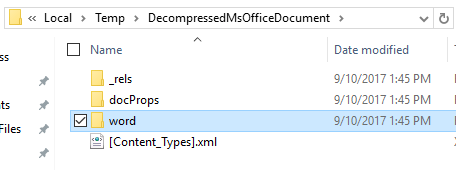 As we know that starting from Office 2007, Microsoft has shifted from traditional binary format to an XML based format for better parsing of embedded objects. For this very reason, we can see that the x in all new extensions of Microsoft Office such as .docx, .pptx,.xlsx, etc. and all the contents of a file can be extracted from files using software like 7zip.