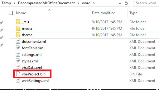 If OfficeMalScanner detects an embedded VBA macro code, then it places the contents in vbaProject.bin. Below is the directory structure of the whole inflate command output.
