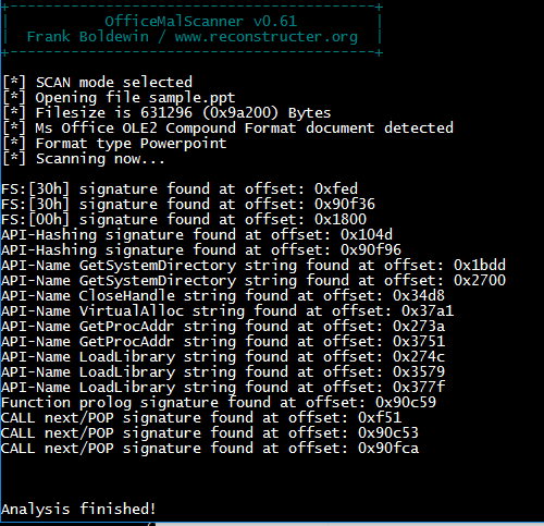 We can also use OfficeMalScanner scan command to look out for known signature patterns inside the document. Scan option of OfficeMalScanner looks out for