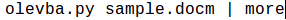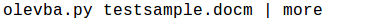 Below is an example of analyzing a malicious document using another tool known as olevba.py was written by Philippe Lagadec which is used to automatically parse the contents of Microsoft documents (both binary OLE format and new XML documents), extracts and display the embedded macros. This script also analyses various portions of the document and shows the risky portions out of it.