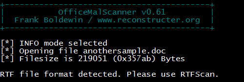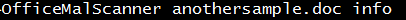 Now let's analyze another sample, running OfficeMalScanner on it like below