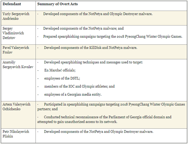 During the years investigating Sandworm, the DOJ charged six Russian nationals for their alleged part in the NotPetya, Ukraine power grid and Olympics cyberattacks in a note that was published in October 2020. The list of the six defendants is presented below.