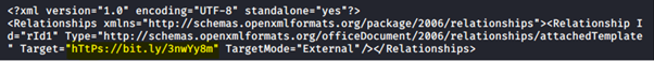Figure 3: bit.ly URL inside the doc file that downloads the external template with VBA macros.