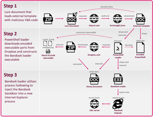 After that, the macro code drops and executes the second stage — a PowerShell payload encrypted inside the original Word document. Finally, the PowerShell script downloads and executes the last stage of Bandook: the backdoor. The following image shows the high-level diagram of this threat.