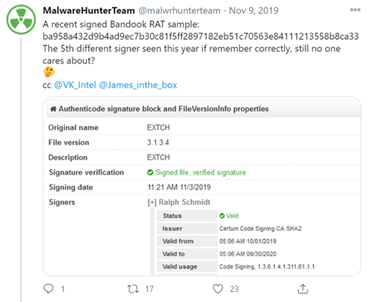 Figure 7: Valid signature information of a newly discovered Bandook sample.