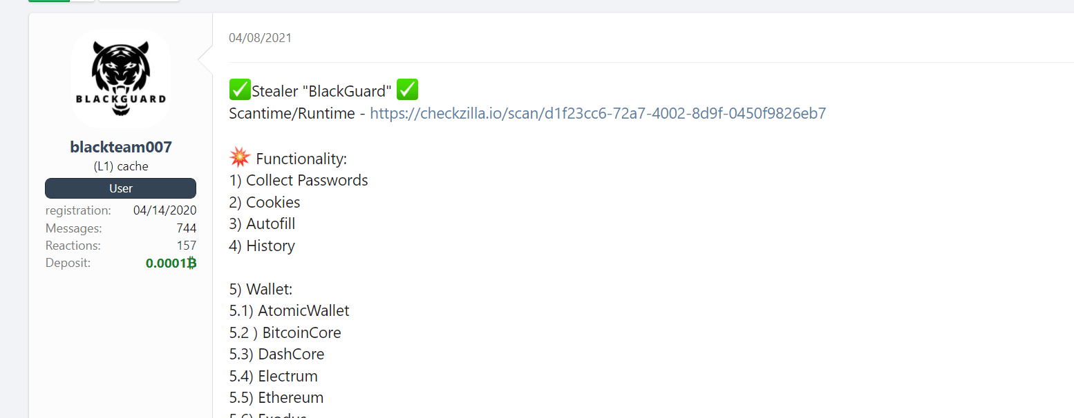 Figure 1: Blackguard stealer shared on underground forums in January 2022.