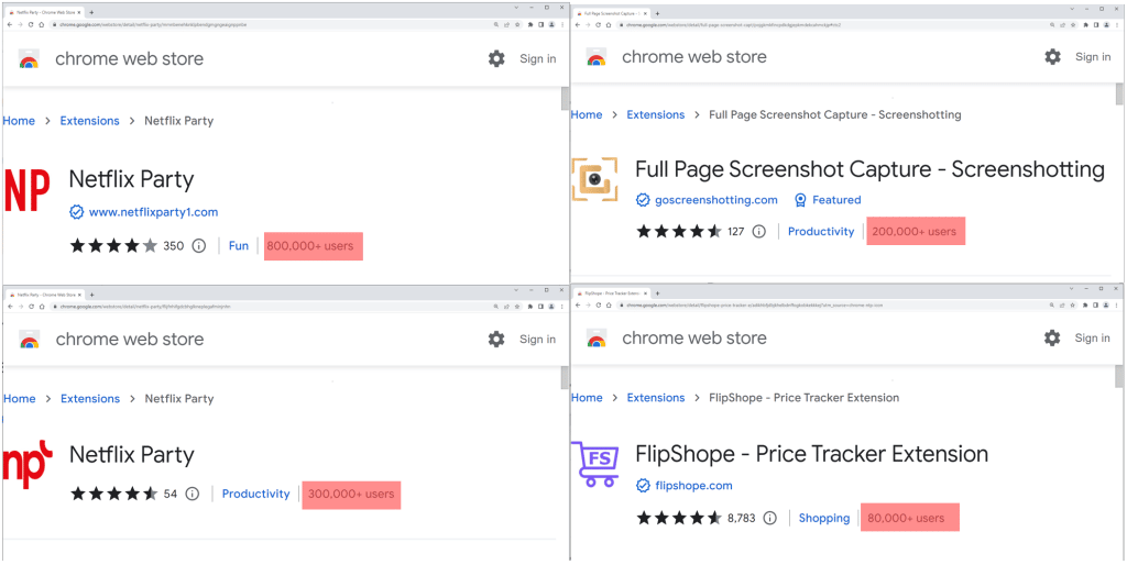 Figure 1: Malicious Chrome extensions scrutinized by the McAfee research team.