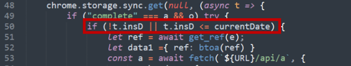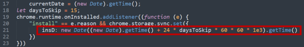 During the McAfee analysis, the researchers also identified a routine capable of bypassing schema detection. In detail, every time the victim runs the extensions, it validates the current date with the installation time. If it is > 15 days from the time of installation, then proceed. With this trick, criminals can avoid automated analysis and security checks.