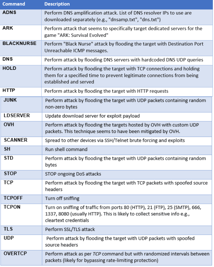 After compromising a new target, the bot connects with the C2 server and can perform specific tasks according to the available commands. The C2 server is hosted over the TOR network, and the botnet nodes access the server by using a hardcoded list of socks proxy IP addresses.