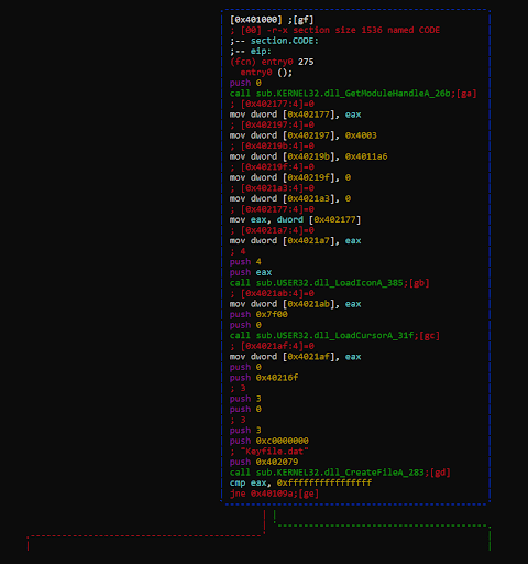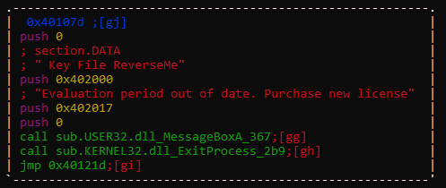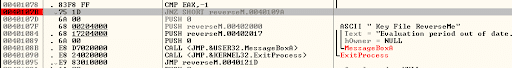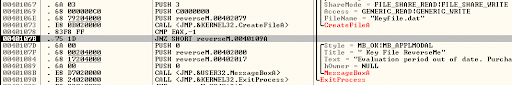 The branch that is colored red jumps to the code which shows us the “license out of date warning” we saw when using OllyDbg.