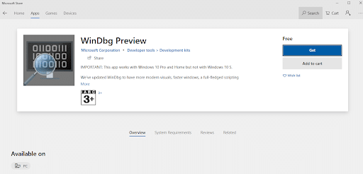 Now let’s see a quick introduction to another popular debugger called WinDbg. WinDbg is a popular debugger used for both user mode and kernel mode debugging. WinDbg has a graphical user interface version called WinDbg Preview, which can be downloaded from the Windows app store.