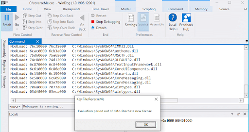 During the process of cracking this challenge, we will understand various concepts of debuggers. When we run this crackme, we will see the following message. Our goal is to bypass this evaluation period warning by reversing this binary.