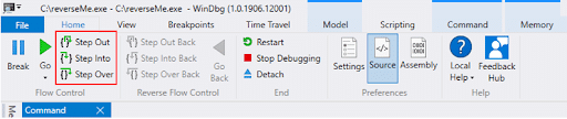 Like we did with OllyDbg, we can also use WinDbg for single stepping through the instructions. This can be done using the command line option p or we can use the GUI button shown below.
