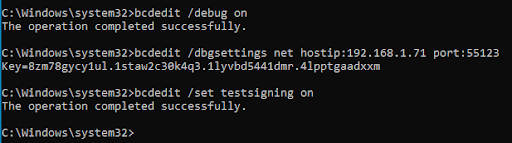 We have enabled debugging and configured debugging over the network. 192.168.1.71 is the host machine and we chose to use the port 55123. Finally, we have enabled testsigning for debugging. We should take note of the key we have gotten in the second command. This is going to be used when connecting from the debugger.