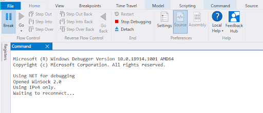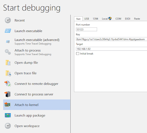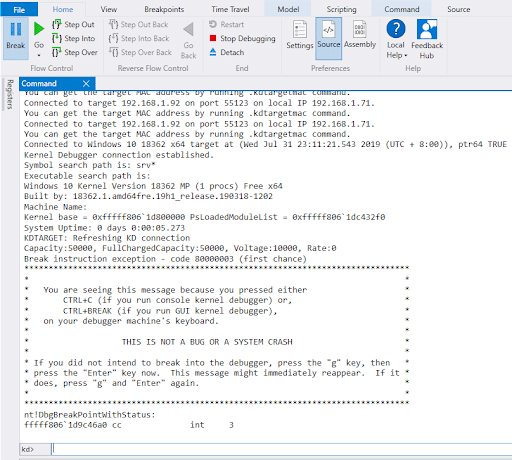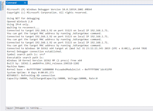 We have entered port 55123, which we configured earlier on the target machine using bcdedit. The key was also noted down earlier and we have entered the IP address of the remote machine being debugged. Finally, click OK and we should see the following: