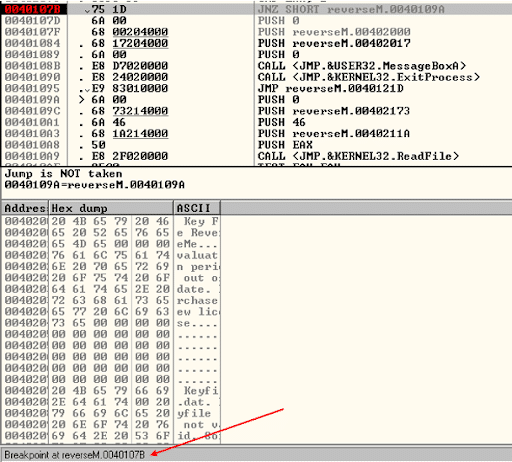 Now let’s set a breakpoint at the JNZ SHORT instruction, which is available just before the warning message. We’re doing this because this is the instruction which is deciding whether the instructions that are showing the warning message box should be executed or not.