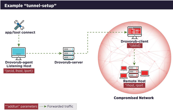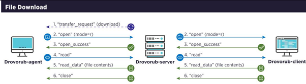 The Drovorub-agent is installed on internet-accessible hosts inside the compromised infrastructure. This agent executable receives commands from its configured Drovorub-server and includes much of the same functionality as the Drovorub-client, except for the remote shell capability.