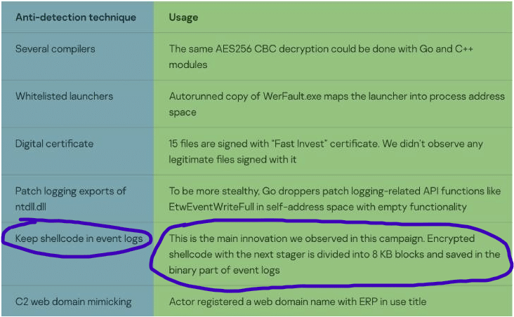 One of the methods highlighted above keeps encrypted shellcode that contains the next-stage malware as 8KB pieces in event logs. This is a new technique never seen before in the wild, in which all the pieces are combined and executed in a single payload.
