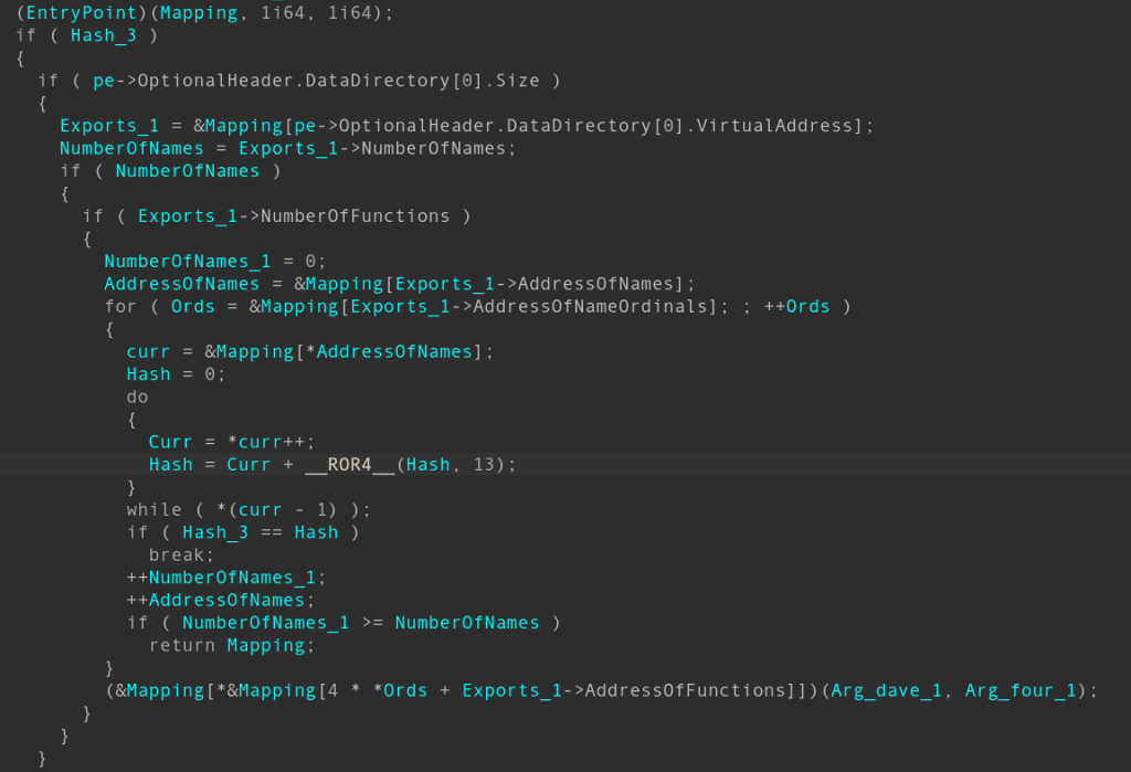 - The standard ROR13 hash of exported function name load inside the trojan (0xE124D840)