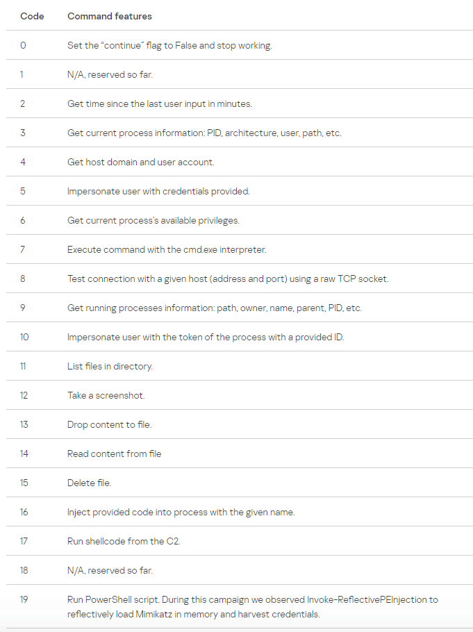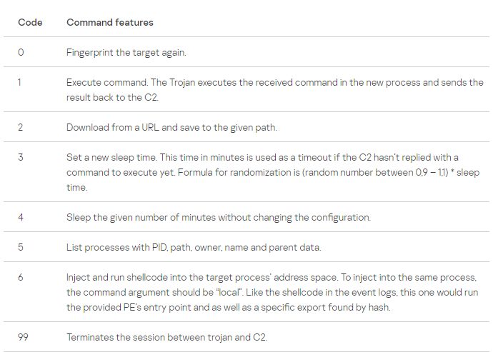 Before establishing the connection, the trojan sends an ICMP ping to check if it can connect with its C2 server using a hardcoded 32-byte long RC4 key. As observed in other strings, the key is encrypted with the Throwback XOR-based algorithm. If the connection with port 80 of the C2 server is available, then the communication starts and the following C2 commands are available: