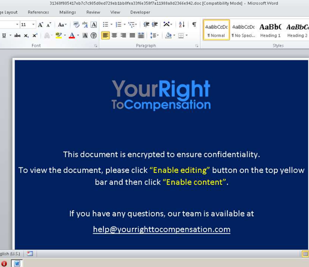 The threat is probably disseminated via social engineering, and the malicious file is inside a ZIP file distributed along with the malicious email in the wild. The malicious file is a Word document dubbed “Compensation manual.doc” that contains fake content to lure the victims. The document pretends to include information about compensation rights for workers.