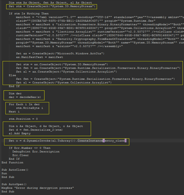 Inside the malicious document, a modified version of CactusTorch (shellcode launcher) is available. In detail, the VBA module uses the DotNetToJscript technique to load a .NET-compiled binary into memory and execute it from VBScript.