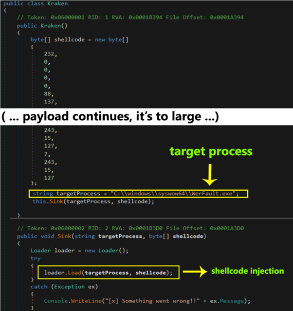 The class Kraken contains inside it a specially crafted payload that is then injected into the WerFault.exe process, as previously mentioned. The shellcode is a variant of a Cobalt Strike payload, and it pretends to evade its detection by using this legitimate process from Windows.