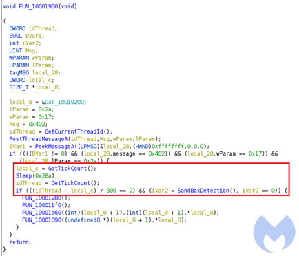 One of the operations executed is whether the process is being debugged. In detail, this task is performed by checking the existence of a debugger calling the native GetTickCount call from Windows.